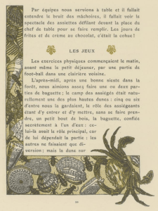 Nous sommes vingt campeurs : chacun a son ouvrage ; chaque jour trois d’entre nous sont désignés pour s’occuper des tentes, deux pour nettoyer, balayer le campement, deux autres à la cuisine : ils lavent la vaisselle , épluchent les légumes : c’est la corvée la plus dure. En dehors de ces corvées, chacun d’entre nous a une occupation. X… est le secrétaire, c’est lui qui tient la caisse ; Y… s’occupe de l’intendance (il a le blanchissage du linge) ; Z… s’occupe des eaux et bois, moi, des jeux pendant la journée ; il y a un lampiste, un autre est préposé au service postal, etc. Voilà pour l’organisation.