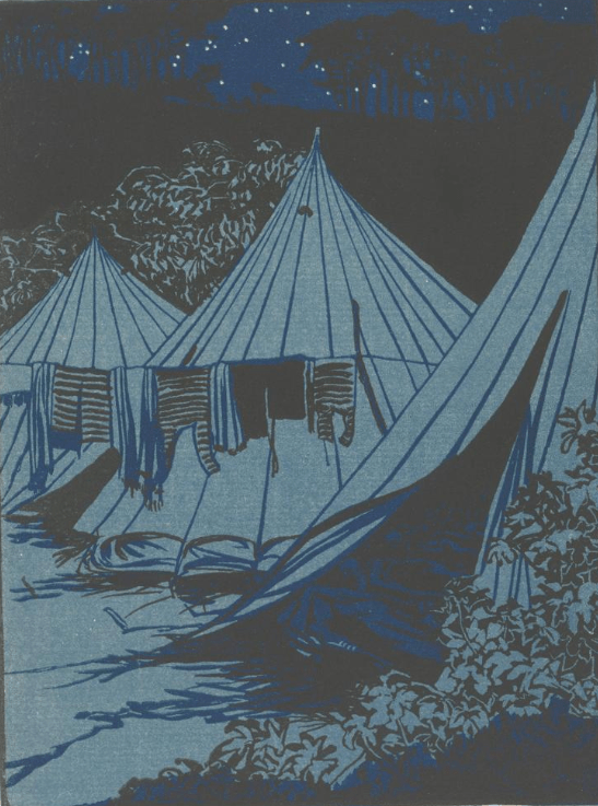 Nous dormons tous parfaitement, sauf quand il arrive des accidents : ainsi, une nuit d’orage et de pluie torrentielle notre tente s’est abattue sur nous : mais nous avons pris cela en riant de bon cœur.