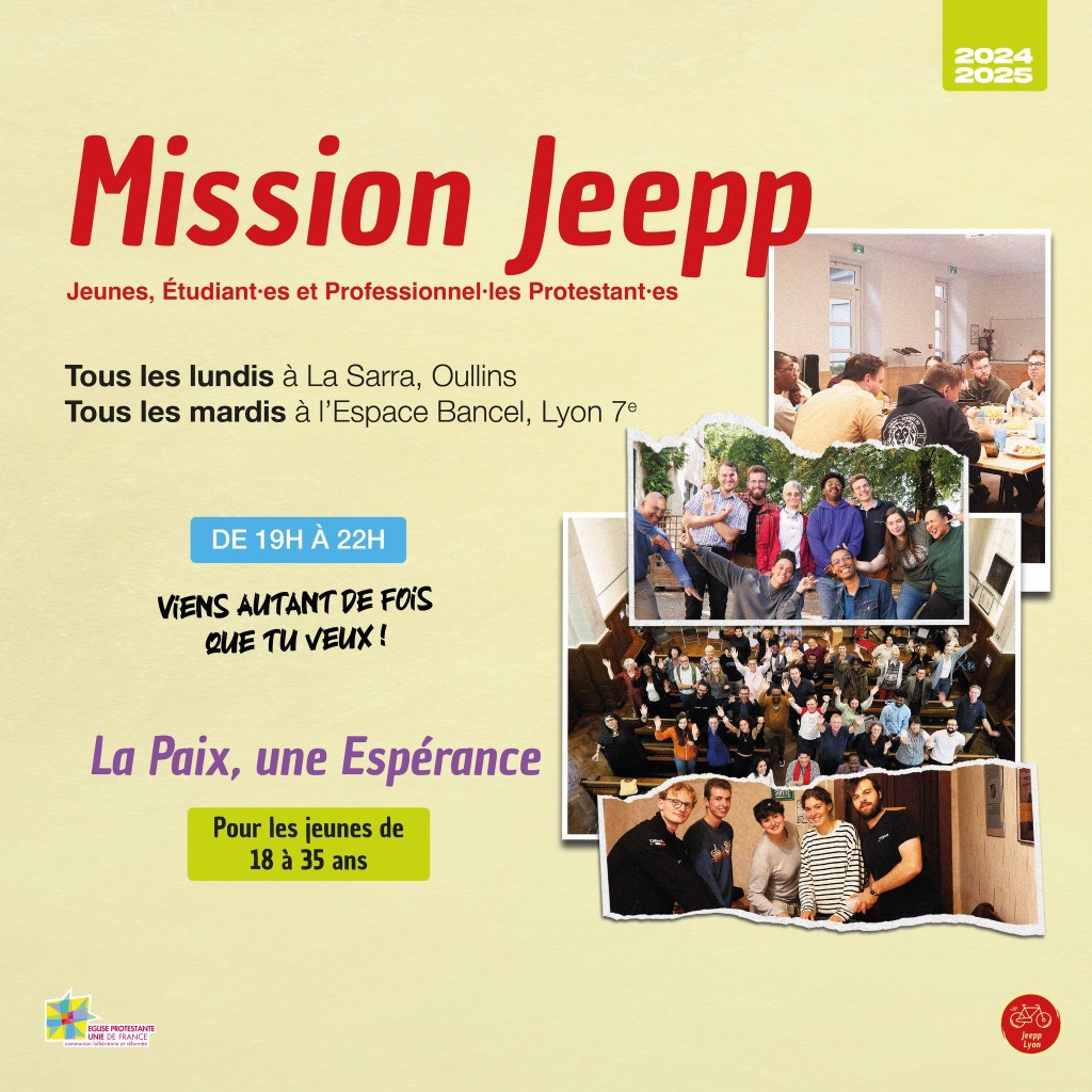 Mission JEEPP est l’acronyme de Jeunes étudiants et professionnels protestants. Son groupe de Lyon a été lancé en 2017, et se rassemble au temple de la Sarra, à Oullins, ou à l’Espace Bancel, à Lyon.