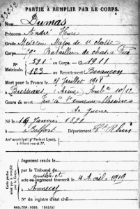 André Henri Dumas (1891-1918) est un étudiant en médecine. Enregistré sous la matricule 123 au bureau de recrutement de Besançon au début de la Première Guerre mondiale, il est médecin aide-major de 1ʳᵉ classe dans le 59e bataillon de chasseurs à pied1. Il est fait chevalier de la Légion d’honneur le 5 juillet 19172. Il meurt à la suite de ses blessures dans l’hôpital de campagne 10/12 à Bussiare, dans l’Aisnes. L’article ci-dessous est publié dans Le Semeur de décembre 1918, rubrique Tablettes d’or.