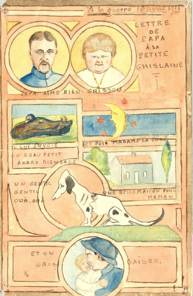 Charles Grauss envoie à sa fille Ghislaine une lettre touchante avec des illustrations sur lesquelles ils étaient tous les deux représentés. Le chien et le canard qu’il mentionne sont des petits jouets en bois peint fabriqués au front, qu’il lui envoie en colis. D’autres animaux de la ferme sont conservés au musée-mémorial de Verdun : un cochon, un âne, un lapin, une souris, un mouton, et une poule, dans une boîte en métal. Un carnet de dessin a également été conservé.